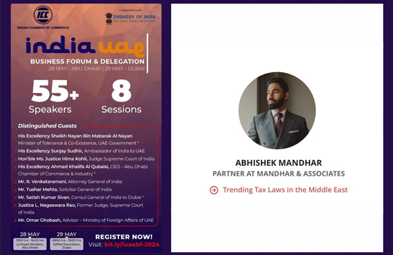 Pleased to announce that our Managing Partner, Abhishek Mandhar will be speaking at The ICC India - UAE Business Forum on May 28-29 in Dubai on "Trending Tax Laws in the Middle East".